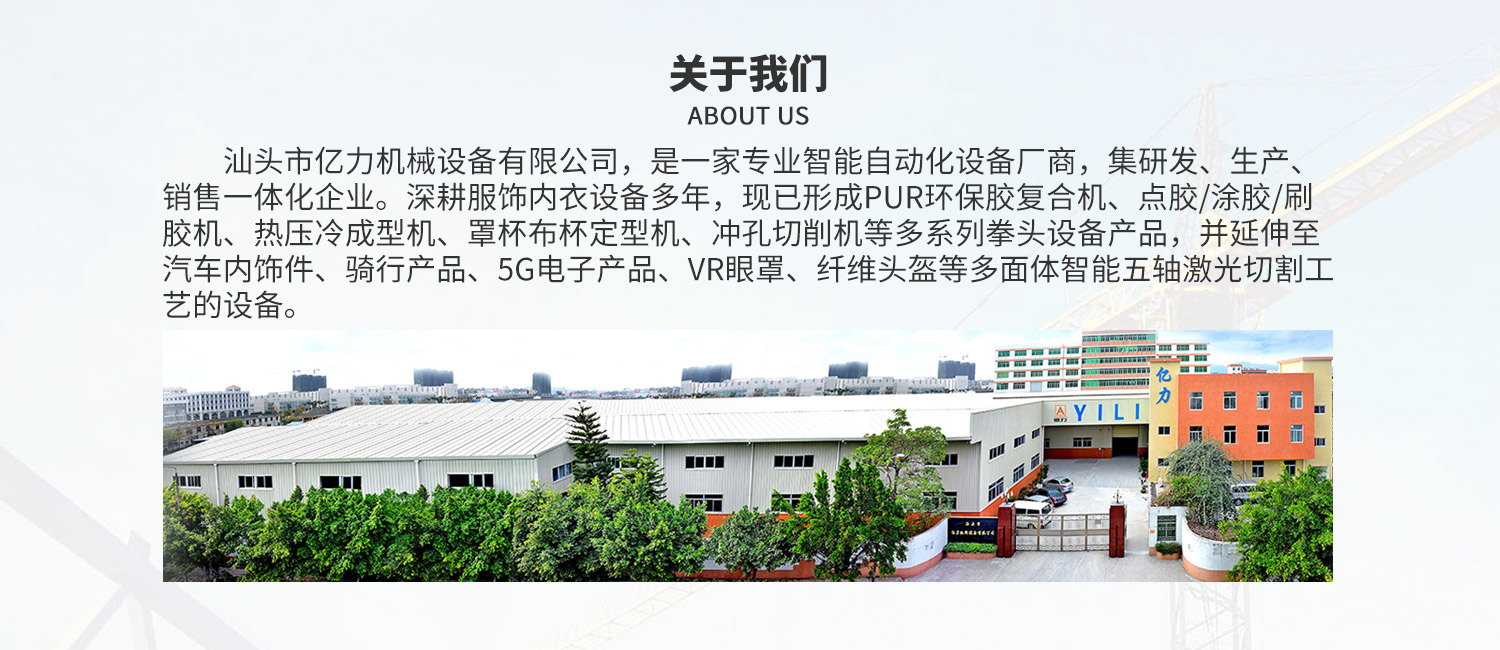 汕頭市億力機械設備有限公司是一家集研發、生產銷售于一體的專業性面料貼合機械、胸圍模杯機械、無縫工藝鞋面機械、口罩生產線和焊耳帶機械企業。
